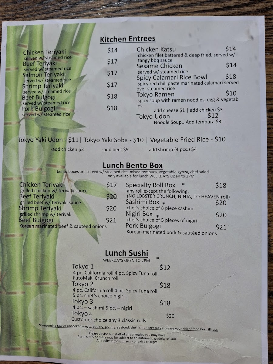The Lunch Bento Box menu is a great option for those looking for a well-rounded meal, featuring choices such as Chicken Teriyaki, Beef Teriyaki, Shrimp Teriyaki, as well as a Specialty Roll Box and Sashimi Box. The Lunch Sushi menu offers variations like Tokyo 1 through Tokyo 4, providing a satisfying sushi experience at lunch.