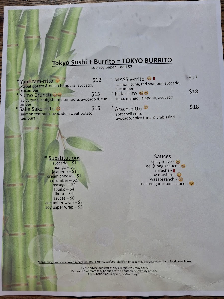 Unique offerings like the TOKYO BURRITO menu include inventive rolls like Yam-Yam-rrito, MASSiv-rrito, and Poki-rrito, blending sushi with burrito style for a fun fusion experience. For those seeking indulgence, the Baked to Perfection Rolls such as B.S.C.R., Fire Red Dragon, and Flaming Torch are sure to please, along with the rich Baked Lobster and Baked Salmon rolls.