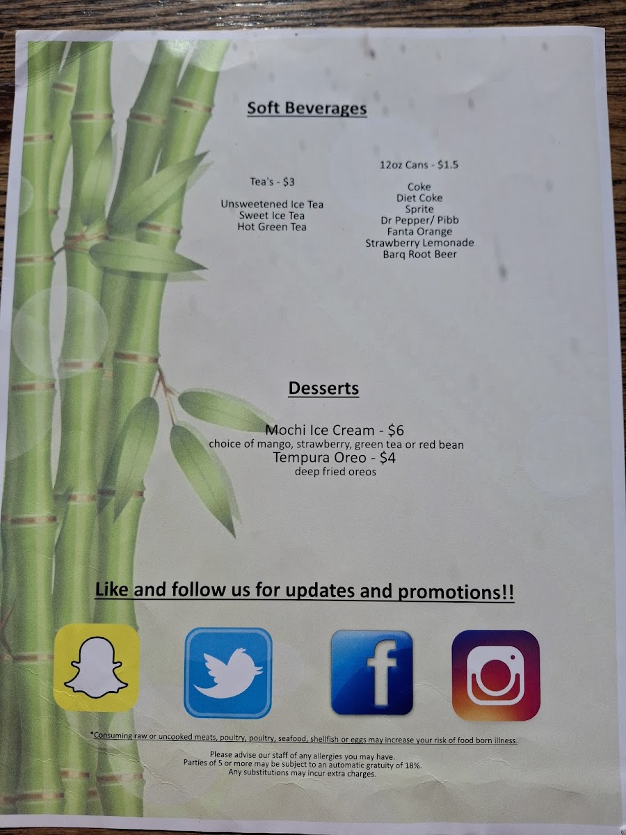 For a sweet ending, Mochi Ice Cream and the indulgent Tempura Oreo are perfect dessert choices. Pair any of your meals with a refreshing drink from their Soft Beverages selection, including Sweet Ice Tea or classic Coke.